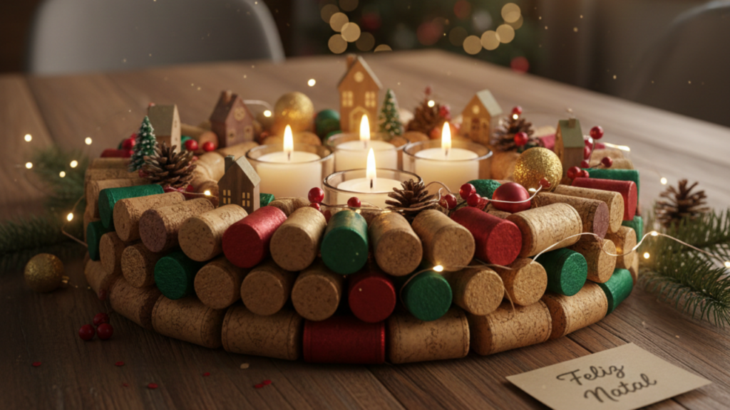Você pode optar por manter as rolhas em seu estado natural, apenas protegidas com verniz, ou pintá-las com cores festivas, como verde, vermelho ou dourado. Essa decisão influencia diretamente o visual do centro de mesa.