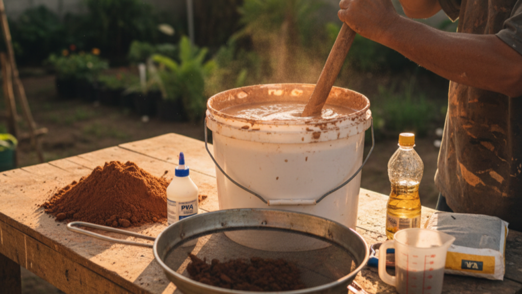 Além do barro, alguns ingredientes simples são fundamentais para a qualidade da tinta. Eles garantem uma boa aderência e durabilidade da pintura, tornando-a mais resistente ao tempo.