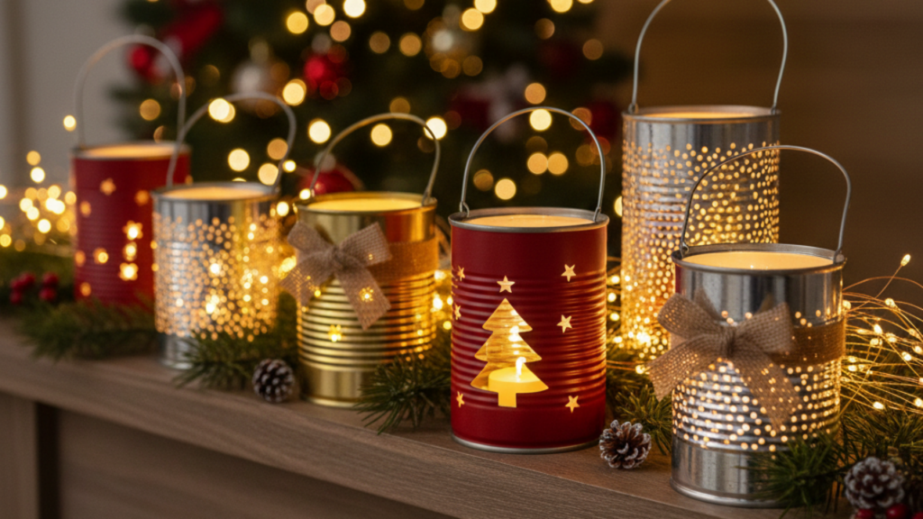 Lanternas de latas recicladas são alternativas minimalistas que levam charme à decoração natalina. Elas podem ser personalizadas com diferentes desenhos e detalhes, criando uma iluminação acolhedora em qualquer ambiente.