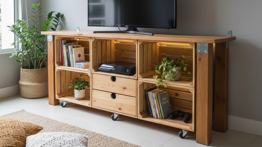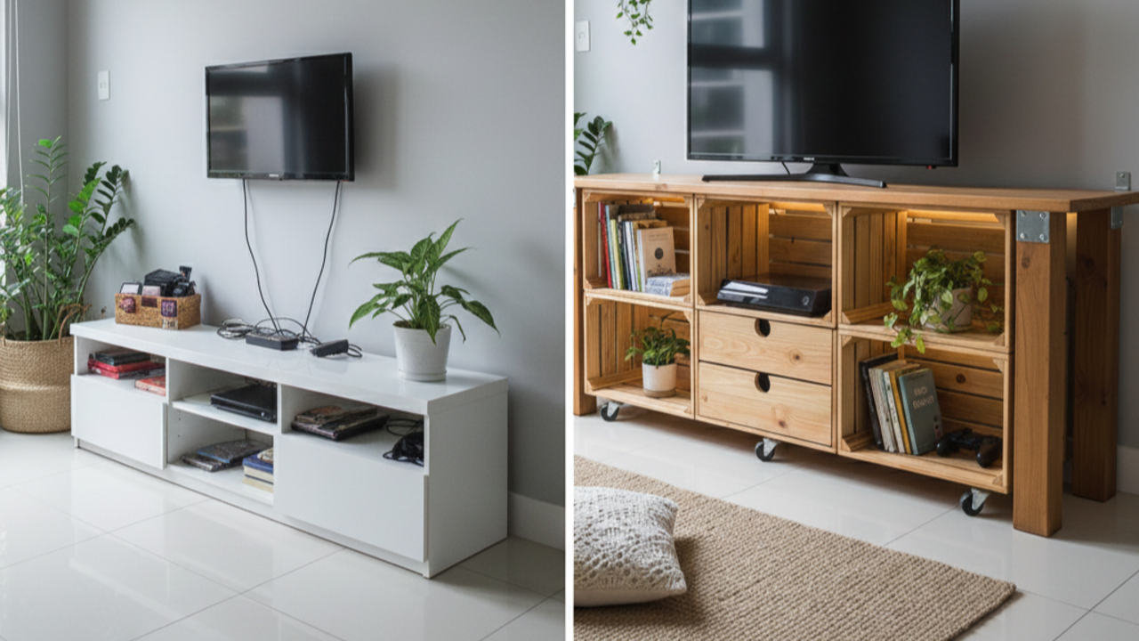 Montar um rack de TV usando caixotes de madeira é uma solução criativa, acessível e que adiciona personalidade à decoração da sala, aproveitando materiais simples como caixotes de pinus para transformar o ambiente de maneira prática e estilosa.