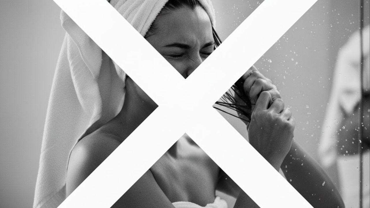 O cabelo recém-lavado fica mais elástico e vulnerável, sendo facilmente danificado com atrito. Usar toalha felpuda, torcer os fios ou esfregá-los com força agride a fibra capilar, provocando quebra, opacidade e frizz ao longo do tempo.
