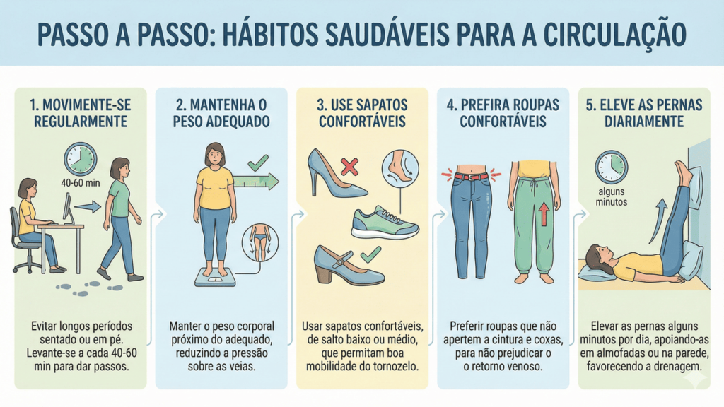 1. Ao acordar: realizar breves alongamentos das pernas e movimentos de flexão e extensão dos pés, ativando a circulação antes de iniciar as atividades.