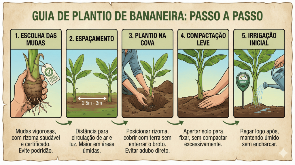 O plantio da banana-nanica pode ser feito com mudas tradicionais ou produzidas em viveiros especializados, devendo sempre estar livres de pragas e doenças para formar touceiras vigorosas. A seguir, um roteiro básico para orientar o produtor no momento do plantio, que pode ser aplicado tanto em pequenos quintais quanto em plantios comerciais: