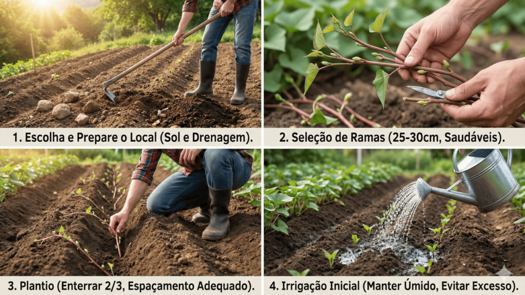 Depois de plantar batata-doce, o manejo diário influencia a qualidade e a sanidade das raízes destinadas ao consumo ou à venda. A cultura é rústica, mas responde bem ao controle inicial de plantas daninhas, à manutenção de cobertura do solo, ao monitoramento de pragas e ao uso de estratégias sustentáveis, como rotação de culturas e reforço de matéria orgânica.