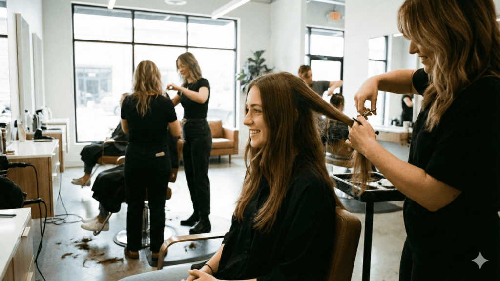 Em vez de dividir o cabelo em muitas mechas e repetir o mesmo movimento várias vezes, o especialista reduz a quantidade de sessões, leva tudo para o mesmo ponto, abaixa levemente a cabeça da cliente e faz um corte único e preciso. Isso torna o processo eficiente, mais uniforme e com menos riscos de degraus marcados, mesmo em cabelos muito cheios, principalmente quando se usa uma tesoura profissional de cabeleireiro com bom fio.