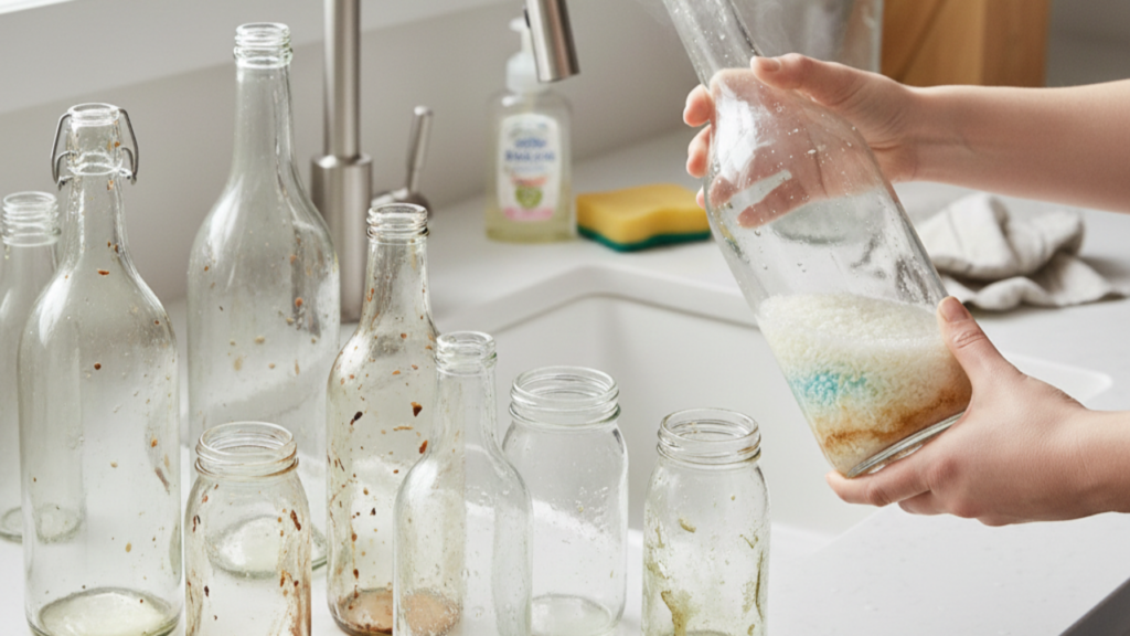 Limpar garrafas e frascos de vidro ou plástico com boca estreita é um drama em muitas casas. A esponja não entra, a escova não alcança o fundo e, quando você percebe, o frasco está com cheiro estranho, manchas e aquela aparência de “velho” mesmo estando quase novo. E o pior: isso acontece justamente com os recipientes que a gente mais usa para água, sucos, molhos, temperos e até armazenar grãos. A boa notícia é que dá para resolver tudo isso com truques simples, baratos e fáceis de fazer no dia a dia, sem esforço exagerado e sem produtos mirabolantes.