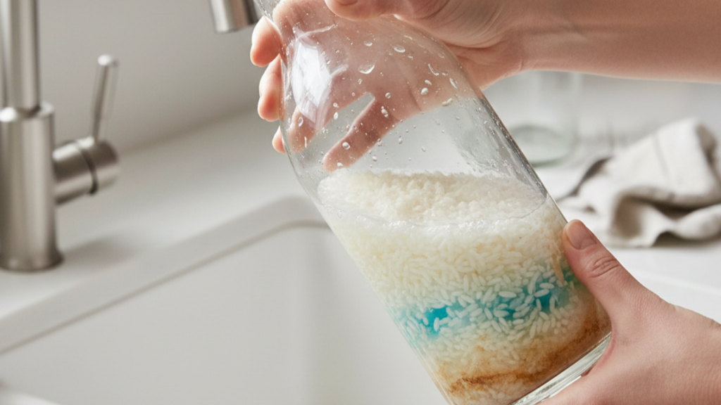 Um dos métodos caseiros mais usados para limpar frascos de vidro por dentro é o truque com arroz cru. Os grãos funcionam como uma espécie de “esfoliante” interno: eles batem nas paredes do frasco, soltam a sujeira grudada e ajudam a limpar até o fundo, sem riscar o vidro quando usados com cuidado.