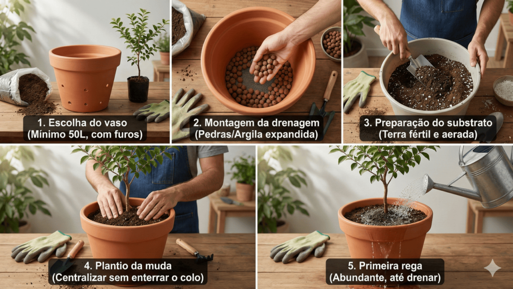 O plantio da jabuticabeira em vaso pode ser organizado em etapas simples, que facilitam o manejo inicial da planta e reduzem riscos de falhas no pegamento. O processo envolve a preparação do recipiente, do substrato e o cuidado com o transplante da muda, preservando ao máximo o torrão original.