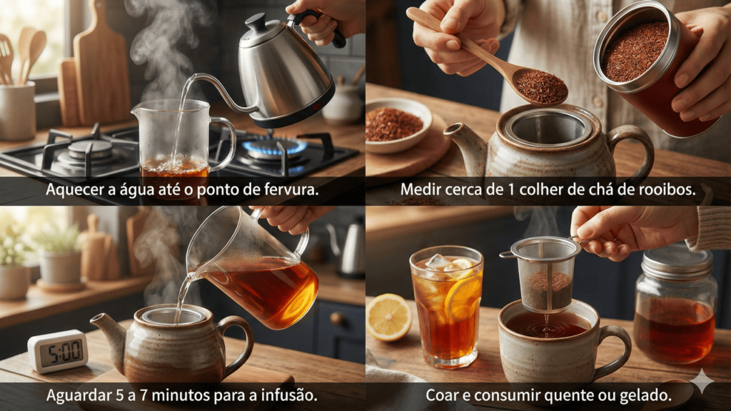 O preparo correto da infusão de rooibos influencia diretamente o sabor e o aproveitamento dos compostos presentes nas folhas. Em geral, trata-se de um processo simples, que pode ser adaptado ao gosto de cada pessoa, mantendo a base de água quente, folhas ou sachês de rooibos e tempo adequado de infusão.