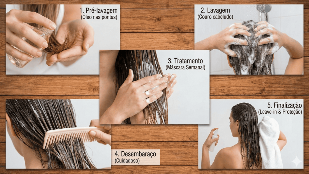 Uma rotina básica pode ser organizada em poucas etapas, repetida semanalmente ou conforme a necessidade do cabelo. A ideia é que cada fase prepare o fio para a próxima, garantindo limpeza, tratamento e um bom acabamento, sem desperdício de produto.