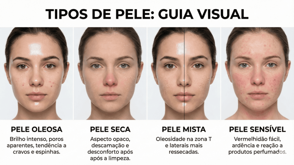 A pele mista combina áreas oleosas na zona T com regiões mais secas nas bochechas e laterais do rosto. Já a pele sensível reage facilmente a mudanças de clima, perfumes fortes, álcool e fragrâncias intensas, apresentando vermelhidão, ardor ou coceira. Uma forma simples de testar é lavar o rosto com um sabonete neutro e observar, após cerca de 1 hora, se há brilho excessivo, secura ou irritação.