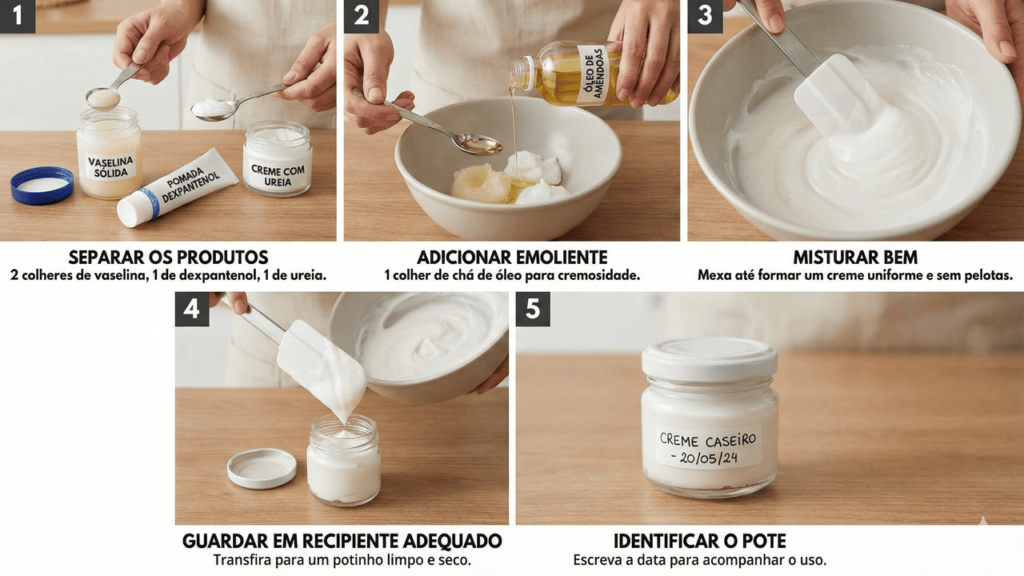 Um jeito simples de fazer um tratamento caseiro para pés rachados é misturar pequenas quantidades de cada produto em um pote limpo com tampa. Assim, o creme pode ser usado por vários dias, desde que guardado em local seco, arejado, longe de calor excessivo e de contaminação por água ou sujeira.