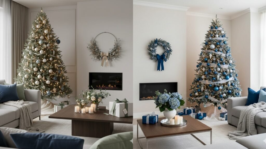 - Adaptar a árvore de Natal: troque laços vermelhos por tons neutros, inclua bolas azuis ou verdes e use fitas metálicas suaves.