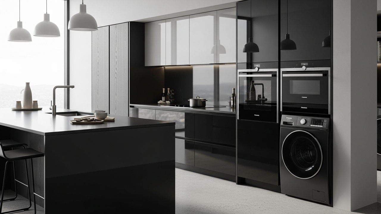 A frente em vidro escuro (“Dark Glass”) traz uma aparência mais sóbria e facilita limpeza. O material se integra a projetos modernos com predominância de preto e superfícies refletivas.