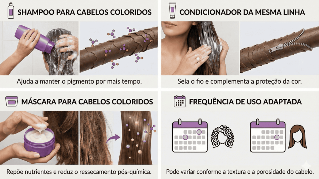 Para organizar melhor essa rotina, vale ter em mente alguns produtos-chave que ajudam na preservação da cor e na recuperação do cabelo após a química. A lista abaixo destaca itens básicos que podem ser ajustados conforme o tipo de fio e a frequência de lavagem: