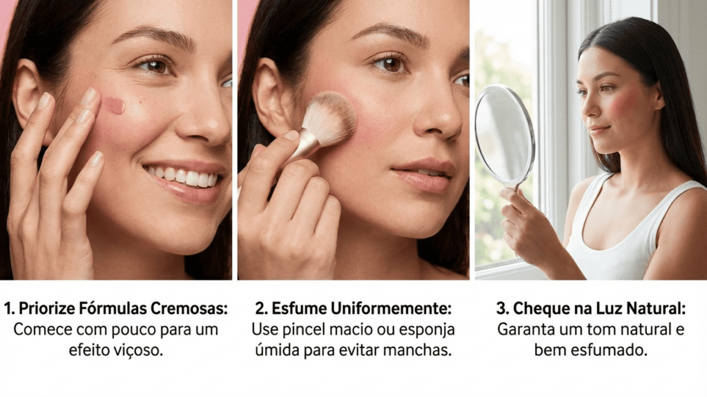 Para conseguir o efeito de blush natural, a aplicação é suave e bem esfumada, concentrada na parte alta das maçãs e levemente em direção às têmporas, sem linhas marcadas. Muitos maquiadores também aplicam um toque no topo do nariz, imitando o rubor causado pelo sol e deixando o rosto com ar descansado.