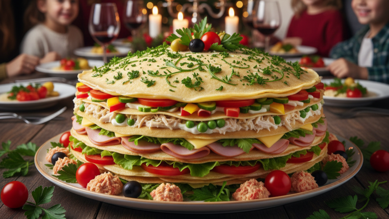 A torre de panquecas salgadas é um clássico das ceias de fim de ano, perfeita para quem busca um prato frio, bonito, econômico e rápido de preparar, que funciona bem tanto como entrada quanto como prato leve em dias quentes.