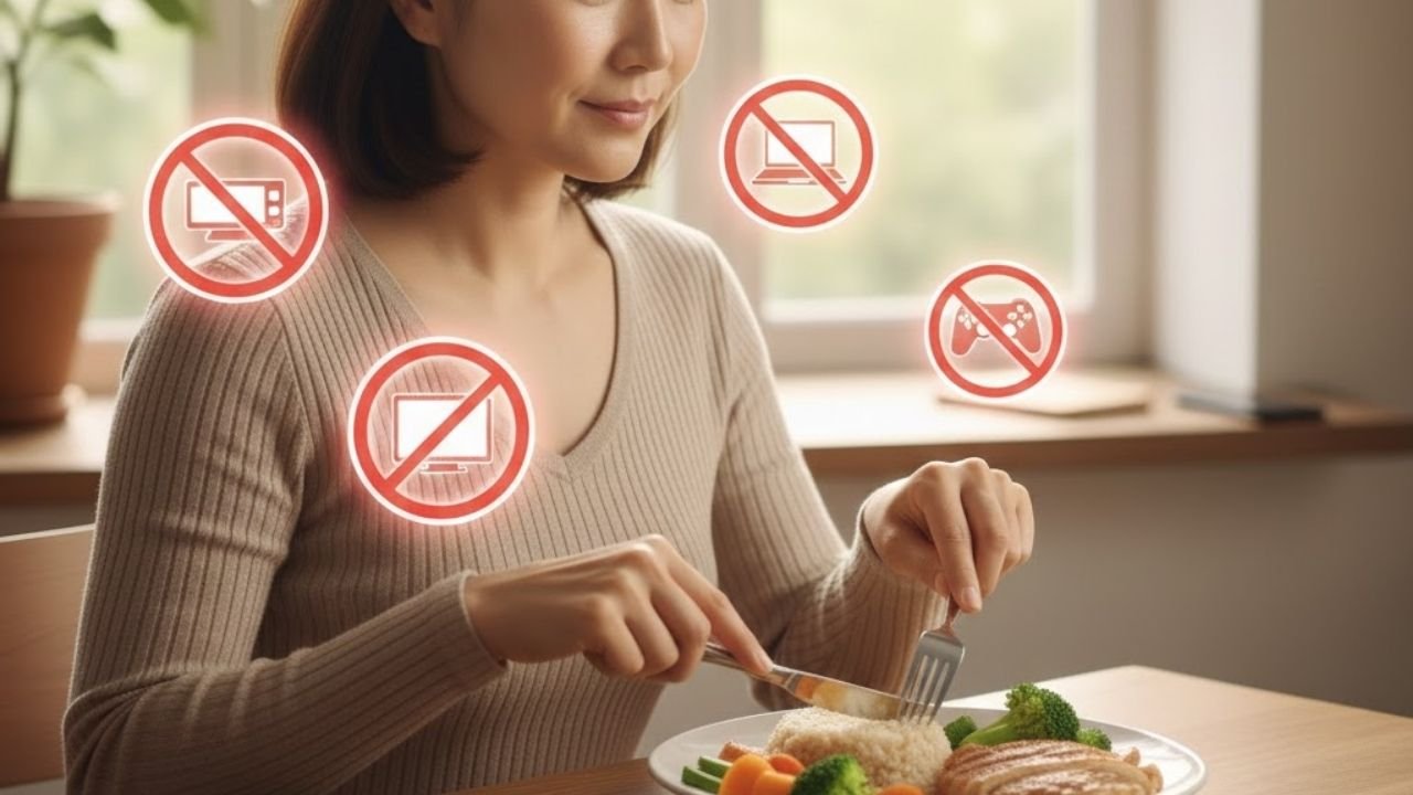 | Comer em frente à TV | Sentar-se à mesa e focar na sensação ao mastigar |