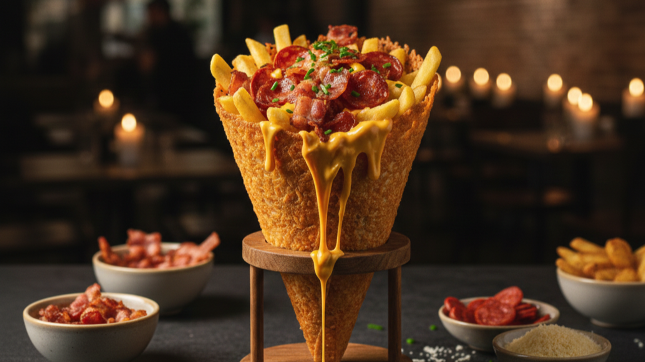 Sirva logo após a montagem, enquanto o recheio ainda está quente e a casquinha continua crocante, preparando vários cones para que cada pessoa pegue o seu em festas e encontros. Não deixe essa ideia só salva nos favoritos: experimente hoje mesmo, teste variações como frango desfiado ou menos bacon e descubra por que esse cone virou sensação entre quem gosta de petiscos ousados e cheios de sabor.