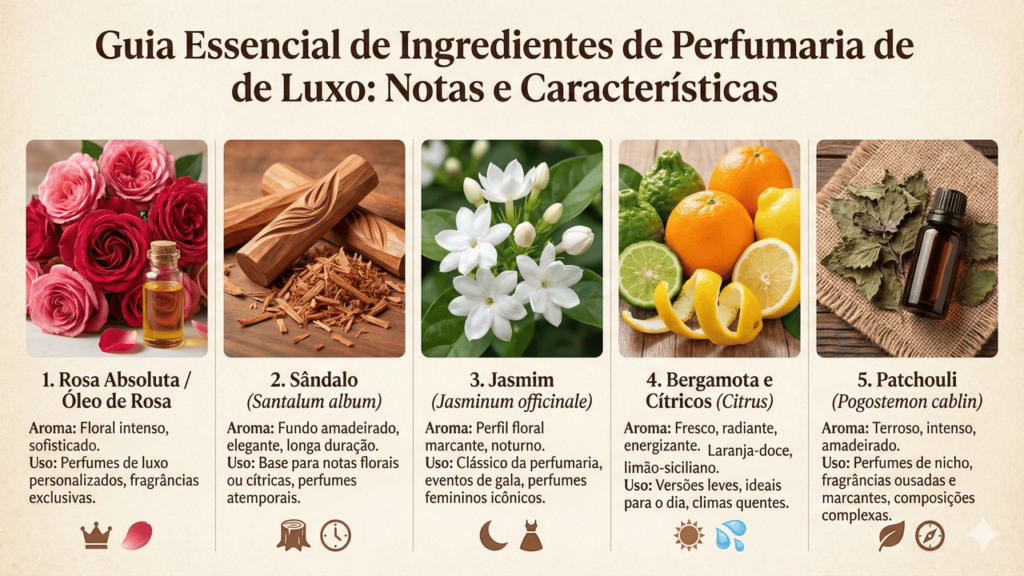 Ao falar em óleos essenciais usados como perfume, alguns nomes aparecem com frequência em entrevistas e bastidores. Em geral, as combinações envolvem uma base mais suave, notas de coração marcantes e um toque final que ajuda na fixação na pele.