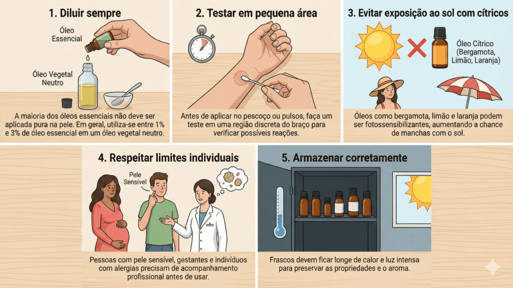 O interesse em reproduzir o segredo aromático de artistas faz muita gente testar óleos essenciais como perfume. Mas, por serem substâncias concentradas, é importante seguir alguns cuidados para proteger a pele e evitar reações indesejadas, principalmente em quem é mais sensível.