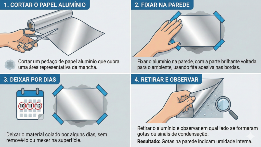 O teste do papel alumínio na parede funciona como um experimento simples de condensação, em que o alumínio age como barreira e mostra onde as gotas se formam. Isso oferece uma indicação inicial se a umidade é interna, externa ou mista, ajudando o morador a reunir evidências antes de chamar um profissional.