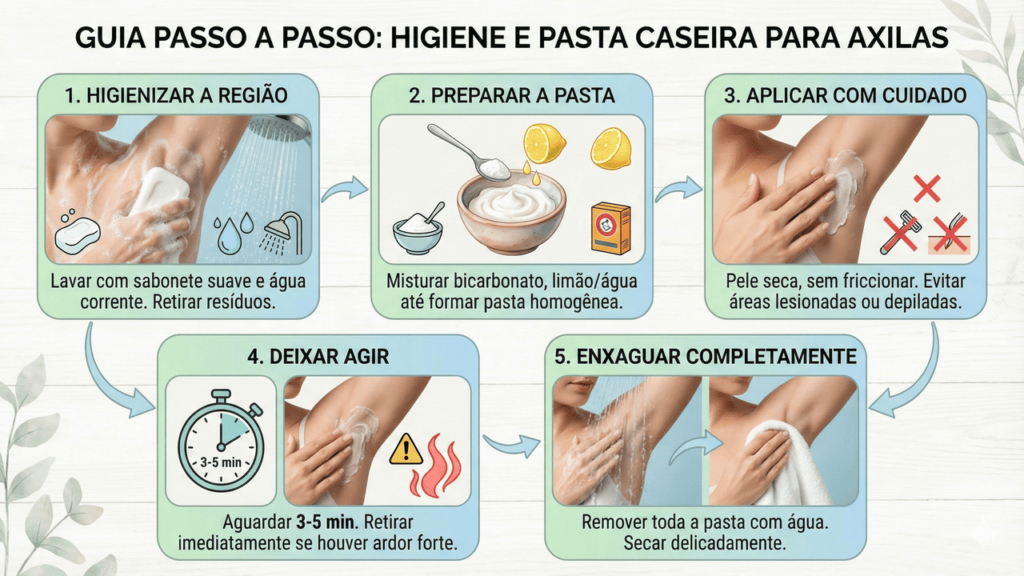 Uma forma simples e conhecida de cuidado é preparar uma pasta para auxiliar no controle do mau cheiro nas axilas. Essa mistura geralmente combina um ingrediente com leve ação esfoliante e outro com potencial antibacteriano, sendo aplicada em dias alternados para diminuir o risco de irritação.