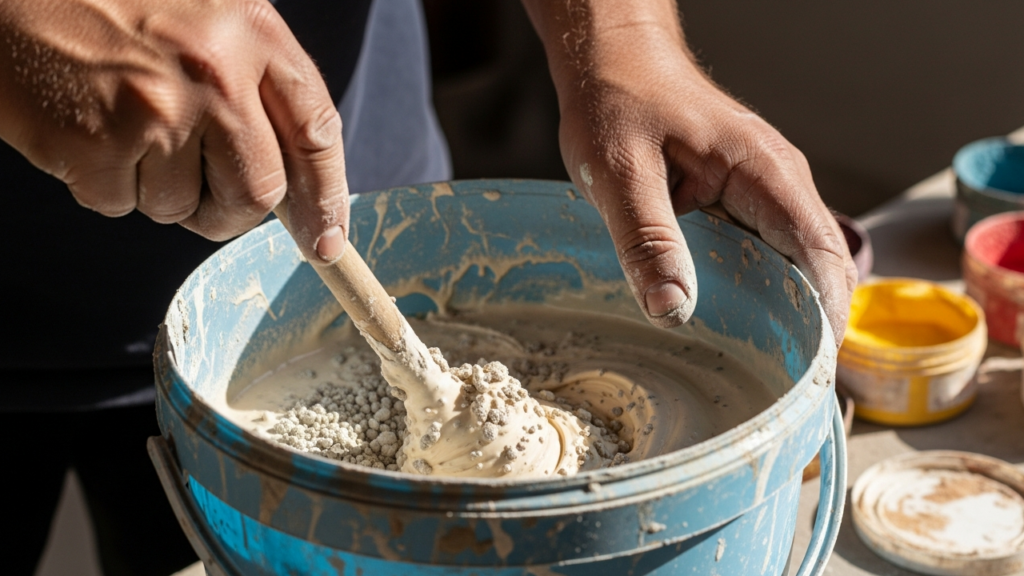 Todo o processo é manual, feito com colher, espátula ou pedaço de madeira, até que a massa fique viscosa e sem grumos de cimento. Se ficar muito grossa, algumas gotas de água podem ser adicionadas com cuidado, evitando perder a densidade que garante cobertura e resistência na aplicação.