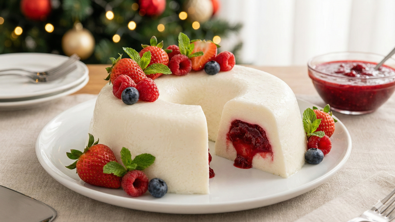 O manjar recheado de Natal combina creme de coco com recheio firme de frutas vermelhas. Visual elegante, preparo simples e sabor equilibrado fazem da sobremesa uma opção leve, moderna e ideal para a ceia.