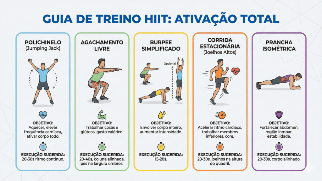 Um treino completo pode juntar de 4 a 5 exercícios em sequência, repetindo esse circuito de 3 a 5 vezes. Assim, você ativa grandes grupos musculares, eleva a frequência cardíaca e aumenta o gasto calórico, mesmo em um espaço pequeno da sala ou do quarto.