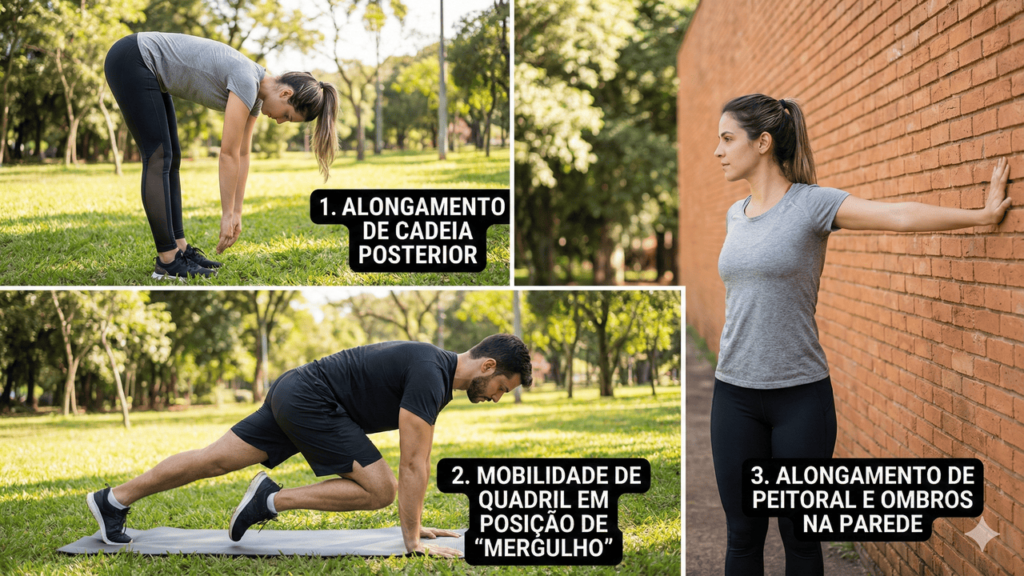 - Evitar alongar de forma intensa com o corpo totalmente frio; caminhar alguns minutos já ajuda a preparar os músculos e a circulação.