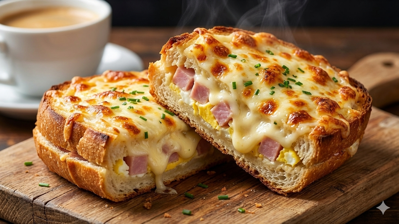 Pão amanhecido vira lanche assado ao ser cortado ao meio, pressionado e recheado com creme de ovo, creme de leite, queijo e presunto. A receita reduz desperdício, economiza e rende opção cremosa, gratinada e versátil.