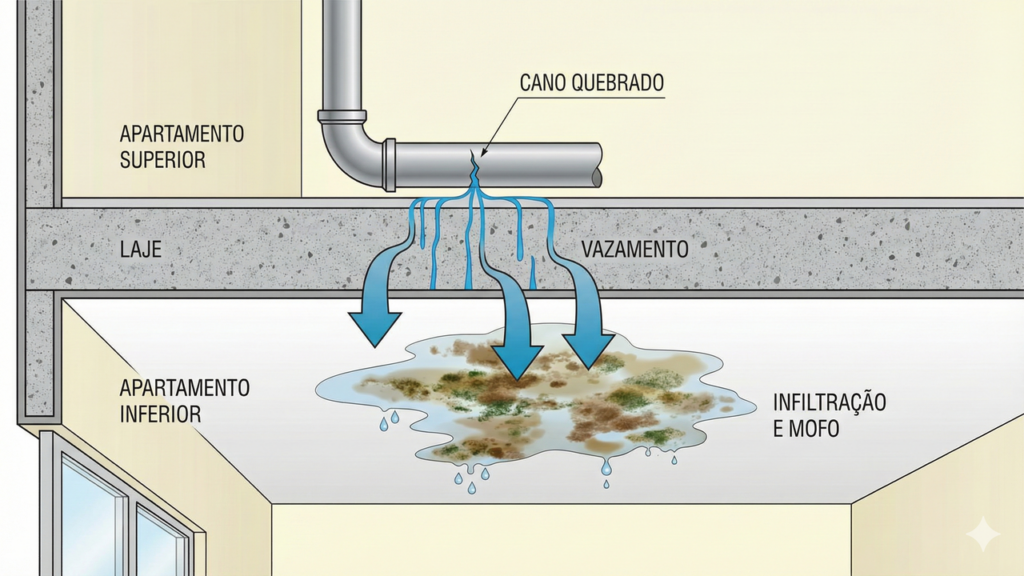 Infiltrações por cano quebrado do vizinho geram manchas, mofo e danos estruturais. A responsabilidade é de quem origina o vazamento ou do condomínio. Registrar provas, acionar seguros e agir rápido evita prejuízos maiores.