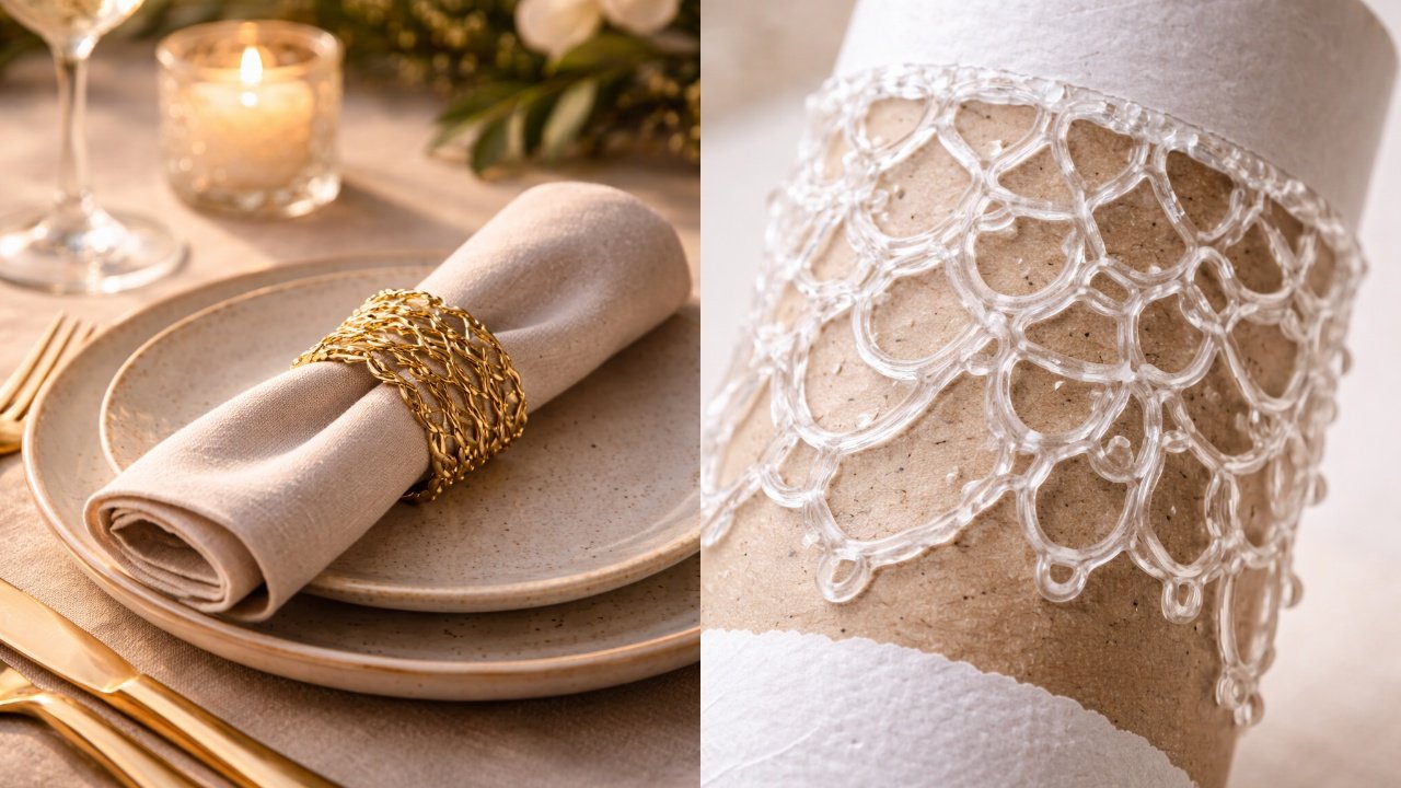 Quando a cola seca, forma um “anel rígido” que abraça o guardanapo e adiciona um toque elegante à mesa. Com a pintura certa, o acessório parece comprado pronto, surpreendendo quem descobre que foi feito com materiais tão simples e baratos.
