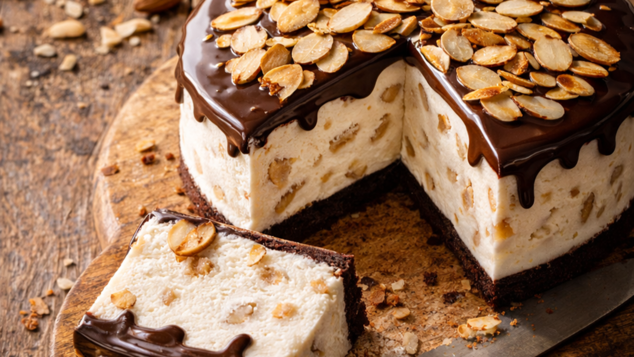 - Finalizar com amêndoas – Espalhar a ganache sobre o Semifreddo firme, polvilhar amêndoas laminadas tostadas e voltar ao congelador até a hora de servir.