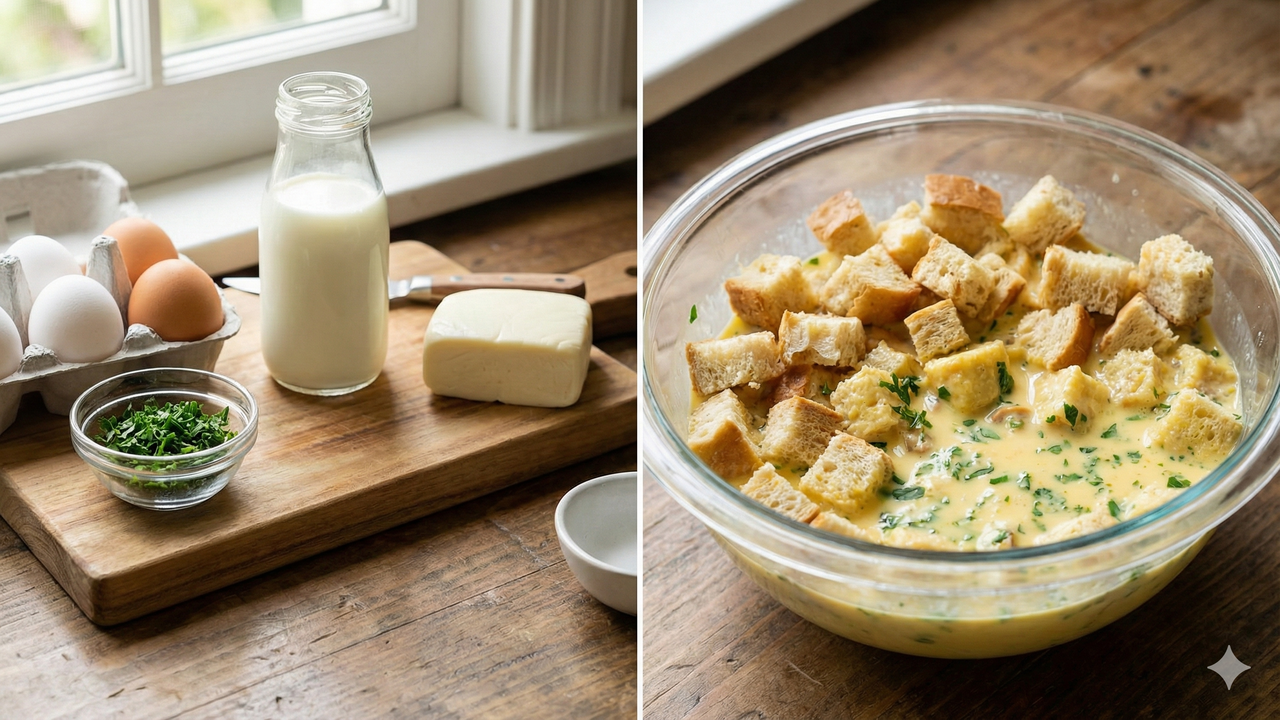 Essa etapa garante que o sabor fique bem distribuído, já que o pão absorve essa mistura de forma uniforme. Quem gosta de variar pode trocar a salsa por outras ervas, ajustar o sal e a pimenta ou até misturar queijos diferentes, sem abrir mão da base de reaproveitamento com pão, ovos e leite.