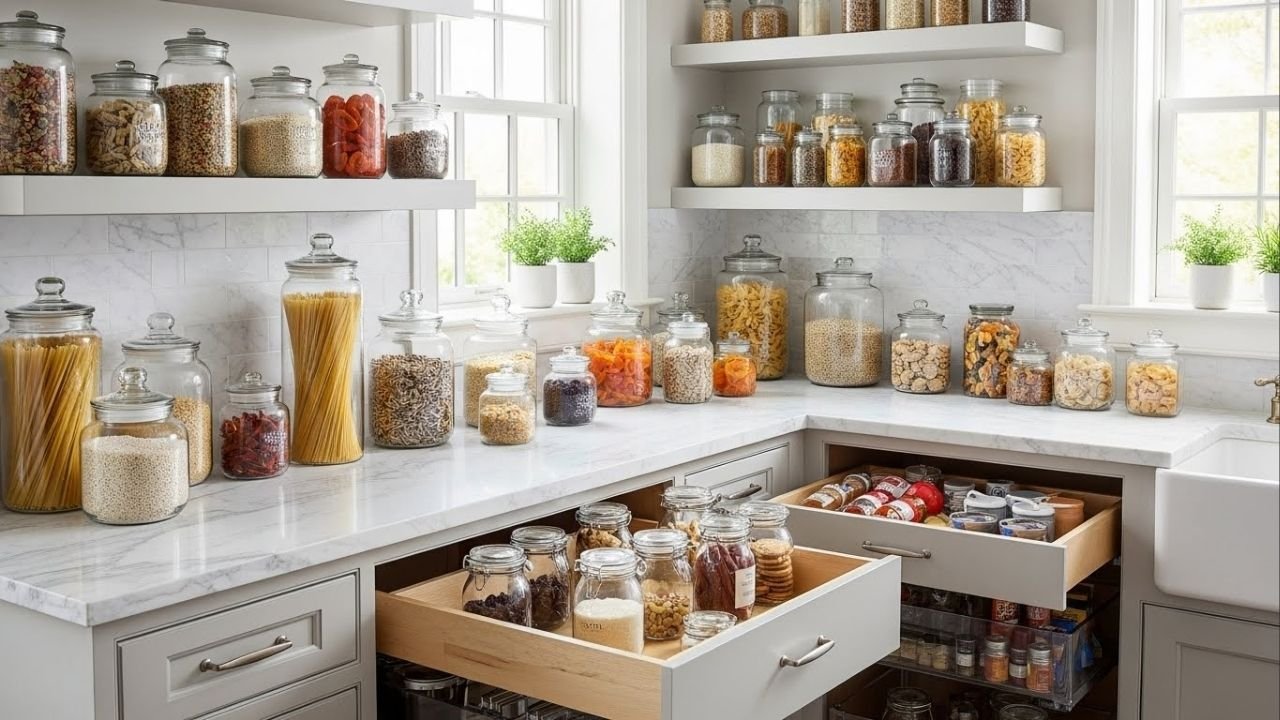 Muitas cozinhas parecem bagunçadas não pela quantidade de itens, mas pela mistura de embalagens coloridas e rótulos chamativos. Apostar em potes transparentes cria unidade visual, reduz ruídos e transforma a organização em um recurso simples e eficiente de decoração.
