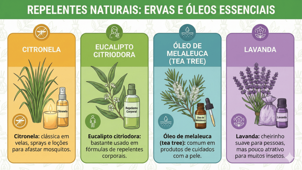 Alguns óleos essenciais também são muito citados em estudos e no uso do dia a dia, pois podem contribuir para afastar mosquitos quando usados corretamente e em concentrações seguras para a pele.