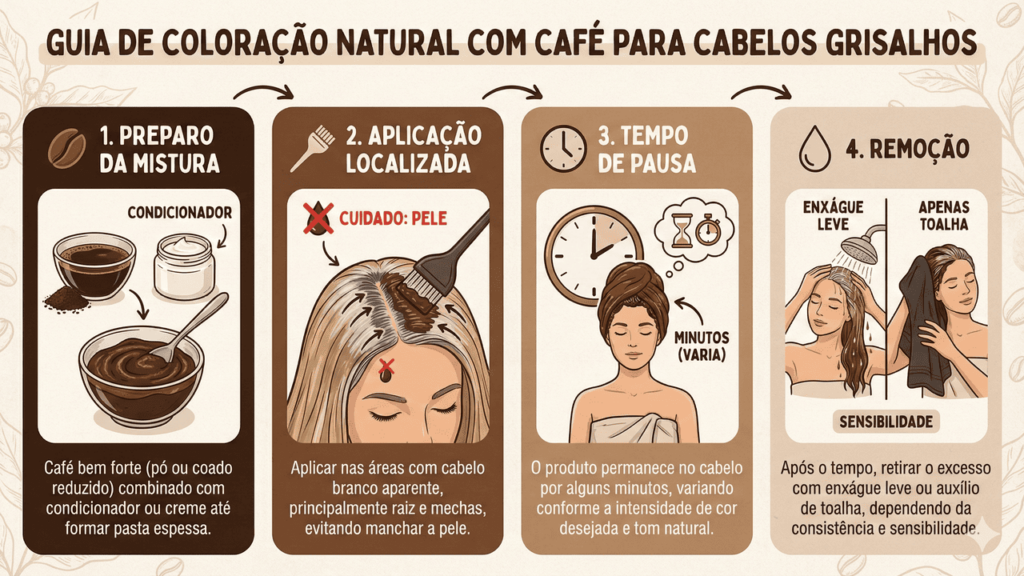 O funcionamento do truque para disfarçar o cabelo branco se baseia em uma coloração superficial, que lembra um “filtro” de cor sobre o cabelo. Os pigmentos do café aderem à cutícula do fio, formando uma película que escurece levemente os fios brancos e os aproxima do tom de base, sem mexer profundamente na estrutura capilar.