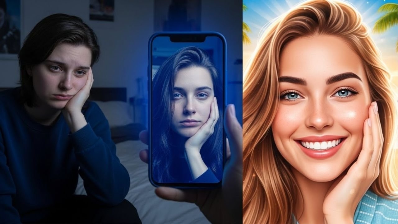 Filtros de IA criam um padrão facial irreal que altera a percepção da própria imagem. Ao comparar o rosto real com a versão filtrada, surgem frustração, insegurança e insatisfação progressiva, afetando identidade e saúde emocional.