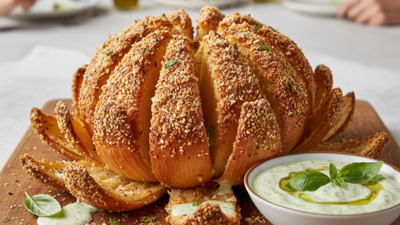 Uma cebola inteira, assada até ficar macia por dentro e crocante por fora, com um empanado cheio de sabor e um molho cremoso de pepino e abacate. Essa receita troca a fritura pelo forno, deixa o prato mais leve e transforma um ingrediente comum em protagonista digno de restaurante, perfeito para dividir na mesa e impressionar sem complicação.