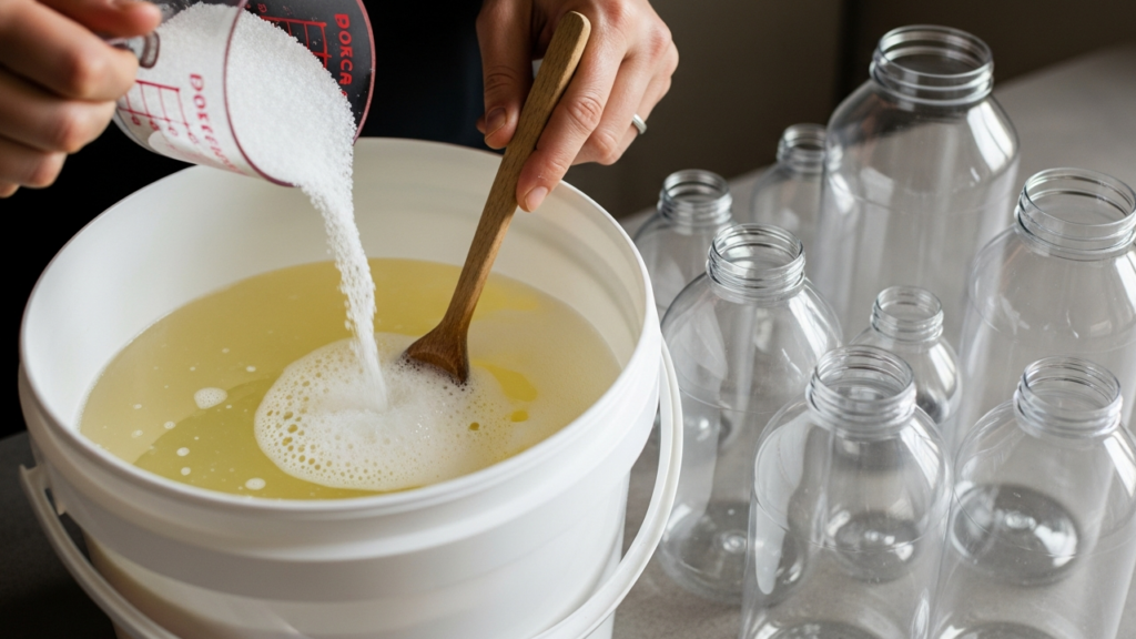 Para facilitar o uso no dia a dia, é comum armazenar o sabão em garrafas PET limpas ou galões plásticos bem fechados. Recomenda-se manter o produto em local arejado, protegido do sol direto, evitar recipientes metálicos e agitar levemente antes de usar, caso perceba separação de fases, identificando sempre o frasco com data de preparo e finalidade de uso.