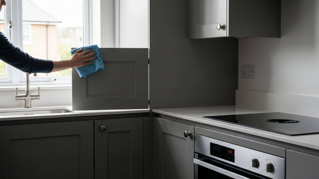 Outro ponto sensível é a proximidade com o fogão e a pia, onde o MDF recebe respingos de óleo, molho, detergente e água. Quando a limpeza é feita apenas “por cima”, sem critério, a gordura se espalha em vez de ser removida, criando a sensação de armário sempre encebado, mesmo logo após a faxina.