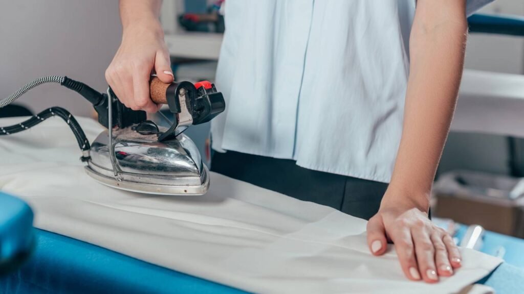 O ferro, preferencialmente a vapor, precisa estar limpo, com reservatório abastecido e temperatura ajustada ao tipo de tecido, respeitando sempre a etiqueta da peça. Um borrifador com água ajuda a umedecer áreas muito amassadas, facilitando o deslizamento do ferro e reduzindo o tempo de contato com o calor.