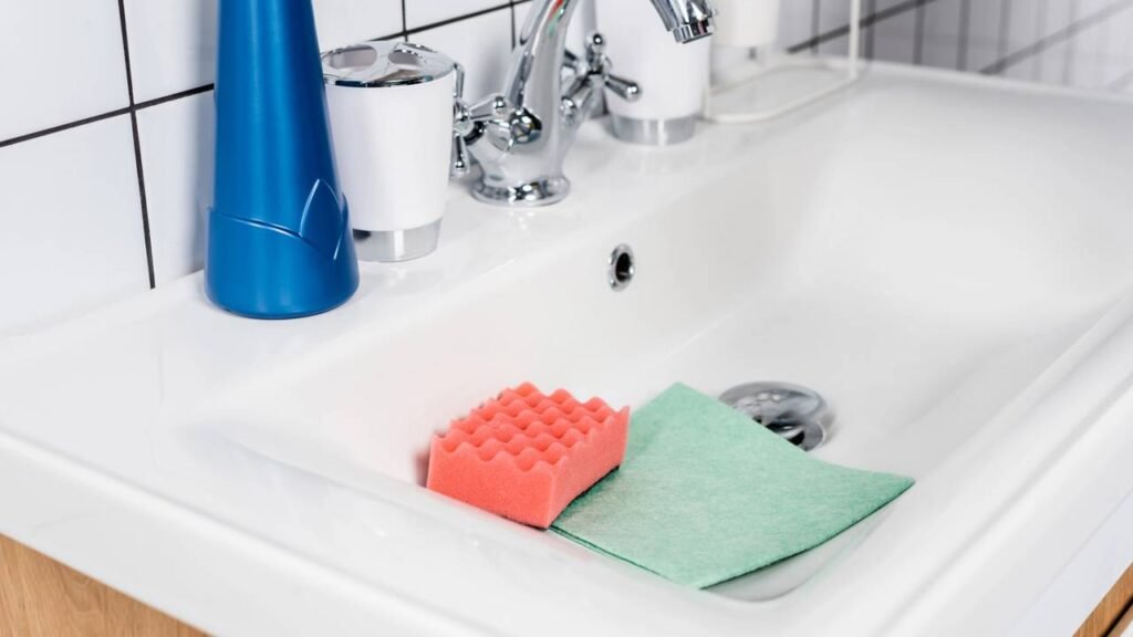 3. Pia e bancada aplicar detergente ou desinfetante na cuba, torneira e bancada, esfregar com esponja e remover o excesso com pano úmido.