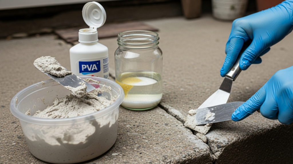 Nessa combinação, o cimento funciona como base endurecedora, garantindo rigidez após a secagem. O açúcar, em pequenas quantidades, interfere no tempo de pega e na formação dos cristais de cimento, tornando a massa menos quebradiça em camadas finas, enquanto a cola melhora a aderência sobre telhas, pisos de concreto e bordas de calçadas.