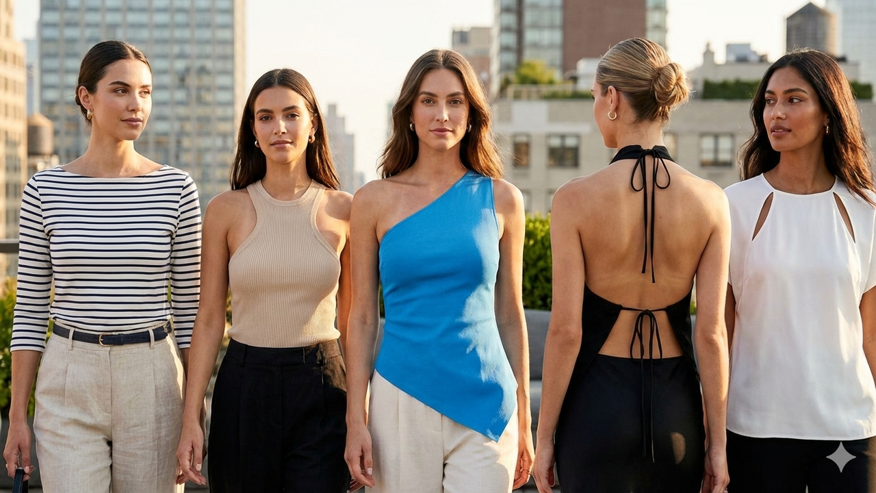 Entre tantos modelos surgindo a cada coleção, cinco blusas aparecem repetidamente em desfiles, vitrines e redes sociais: frente única, listrada, decote canoa, assimétrica e regata nadador. Elas ganham destaque em conteúdos de moda, inclusive no canal HYPNOTIQUE by Fabíola Kassin, que analisa cada peça com um olhar crítico e acessível.