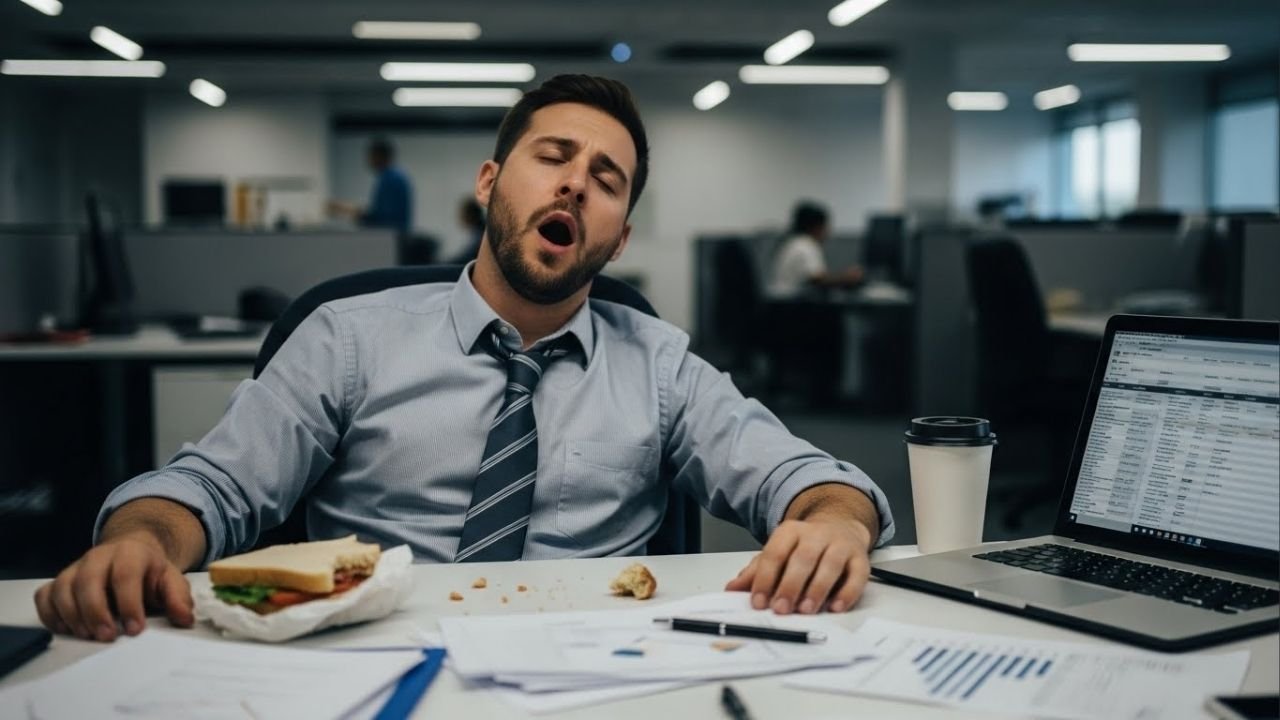 A sonolência no trabalho aumenta após o almoço por causa do ritmo circadiano e do efeito da digestão, com pico de insulina e melatonina. Refeições pesadas, noites mal dormidas e pouca luz intensificam o cansaço entre 13h e 16h.