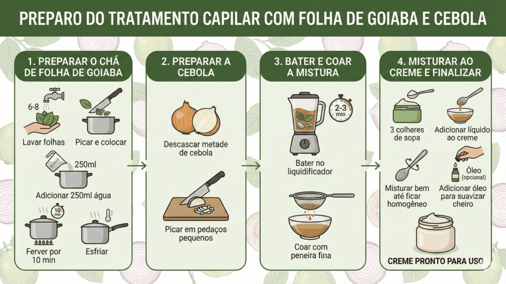 Muita gente aposta nessa receitinha como uma ajuda extra para o crescimento capilar, principalmente quando sente que o cabelo está mais fraco e fino. A ideia é que o enxofre da cebola e as vitaminas da folha de goiaba estimulem os folículos e fortaleçam a raiz, o que poderia reduzir a quebra e dar a impressão de mais volume.