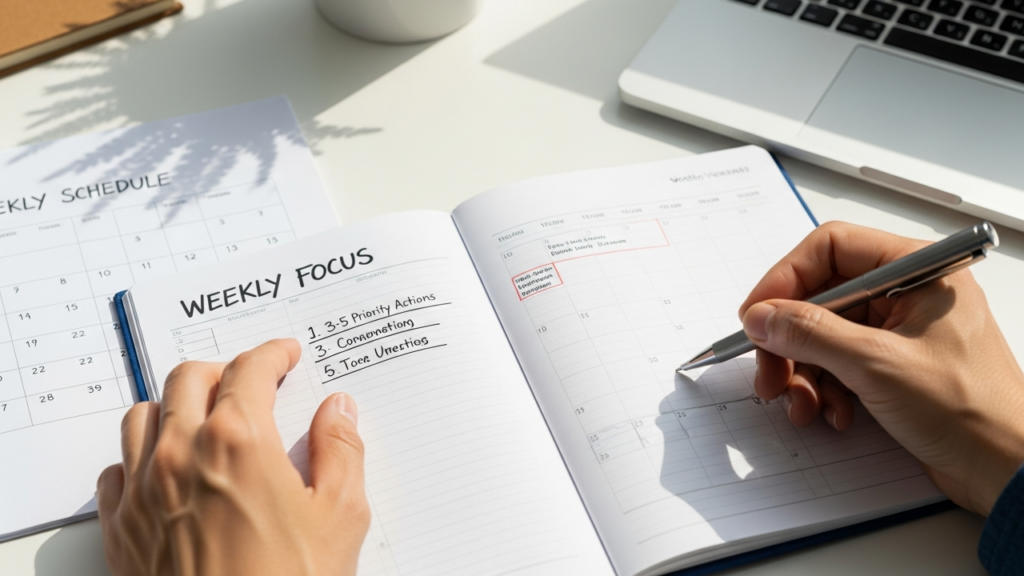 - No início da semana, escolher um foco central, como avançar em um curso ou consolidar treinos.